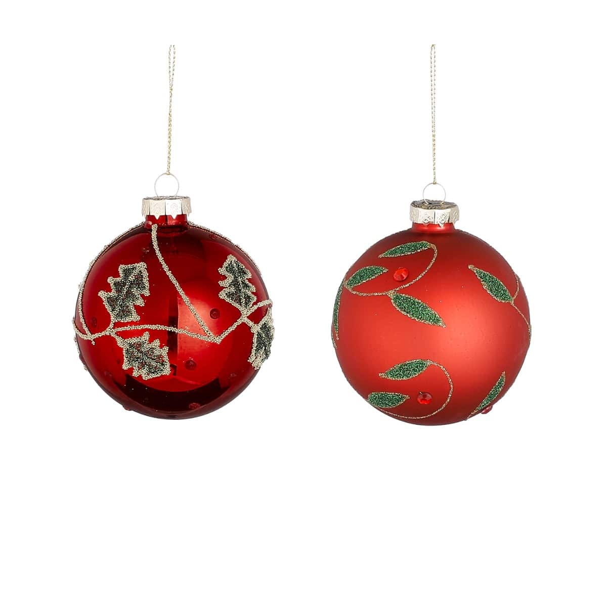 Fine julekugler i klar rød eller mat rød med bladdekoration på. Prøv fx at sætte julekuglerne to eller tre sammen med ståltråd eller krog på det yderste af grangrenene. Mål:Diameter: 8 cmFremstillet i glas.Pakket med 1 stk.