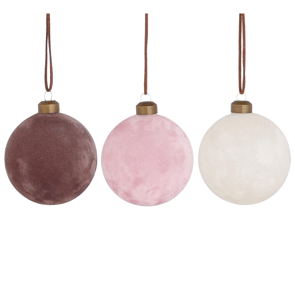 Julekugler med flot blød, velouragtig overflade i farverne; lilla, lyserød eller hvid. Julekuglerne kan fx bruges som bordpynt, juletræspynt eller hænges op som vinduespynt.Mål:Diameter: 8 cmFremstillet i glas.Pakket med 1 stk.