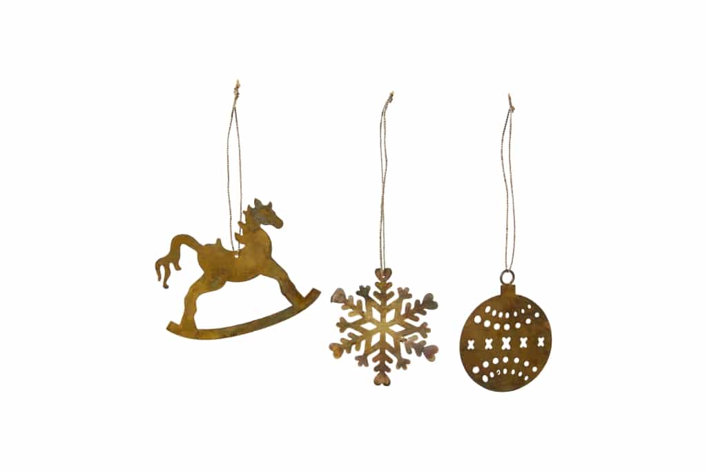 Antik guldfarvet metalpynt formet som enten en gyngehest, et snefnug og en julekugle. Metalpynten er med snor til ophængning på fx juletræet eller i vinduet. Klassisk julepynt fra Speedtsbergs julekollektion.Mål:Diameter: 8 cmHøjde: 10 cmFremstillet i met