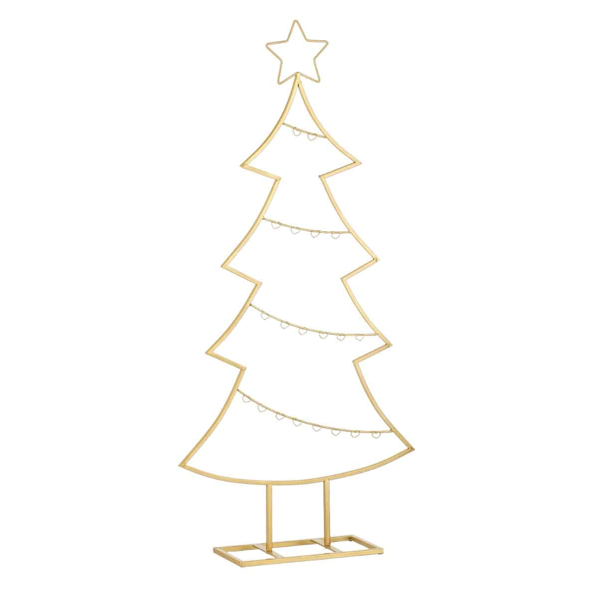 Dekorationstræ i guldfarvet metal formet som et juletræ med stjerne i toppen. Juletræet er med skrå “guirlander”, hvor der kan hænges julekugler eller små julefigurer. Træet fra Mica Decorations er i tidsløst design og fås i flere størrelser, farver og de
