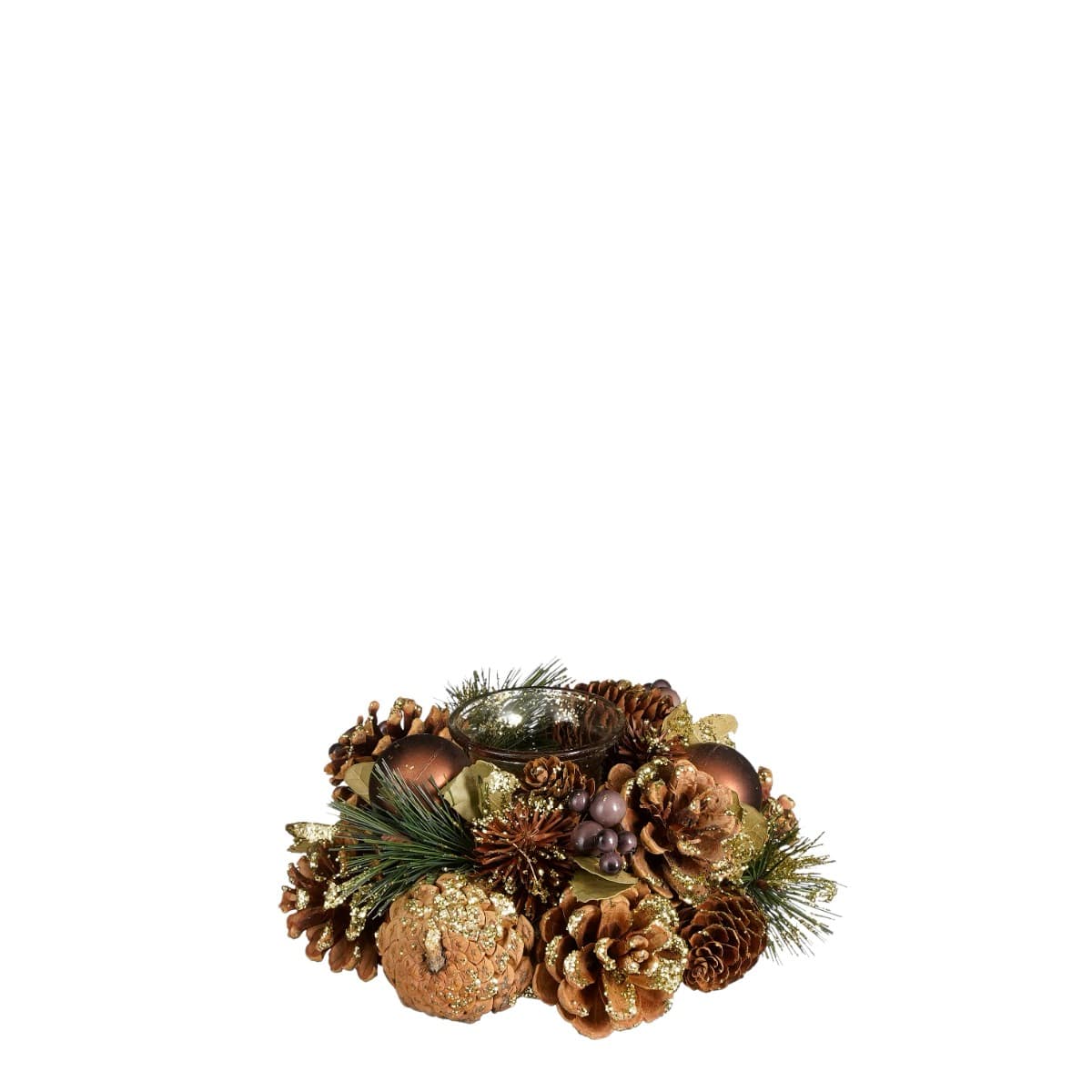 Lysestage med bund af forskellige grankogler, brune julekugler og bær. I midten af stagen er der et glas til fyrfadslys. En hyggelig borddekoration, der holder år efter år. Mål:Diameter: 19 cmHøjde: 9 cmFremstillet af kogler, glas mv.Pakket med 1 stk.