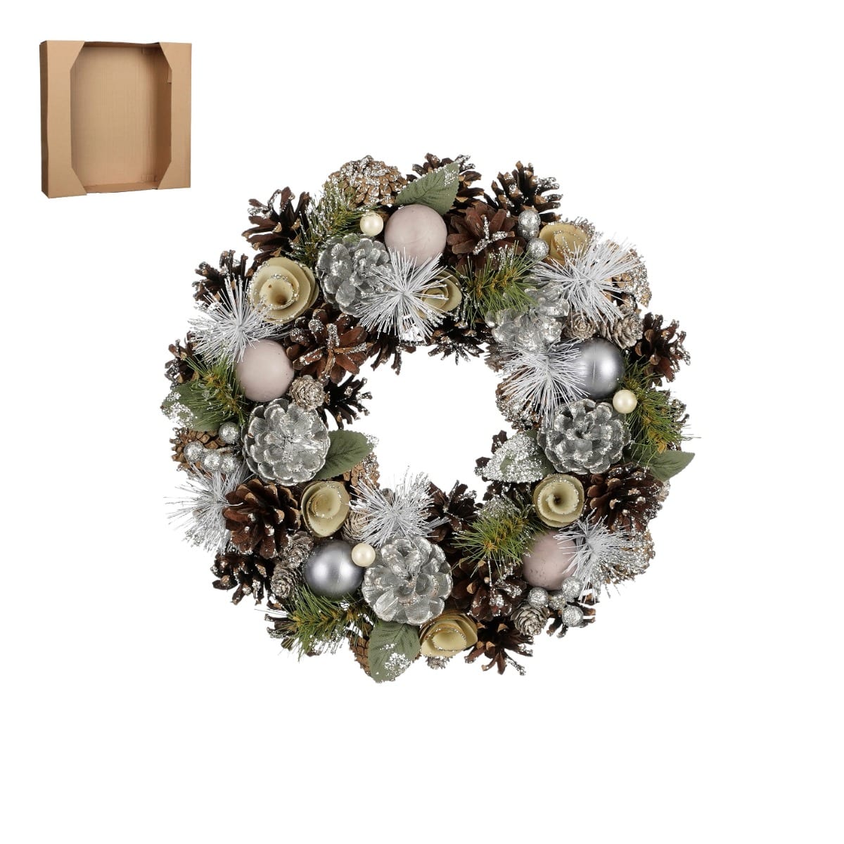 Krans med forskellige naturlige og sølvfarvede kogler, bær, kunstgrønt og hvide/sølvfarvede, matte julekugler. Meget flot sammensat farveudtryk. Kan både hænge på lodrette flader og lægges på borde, skænke mv. fx med et bloklys i midten. Mål:Diameter: 34