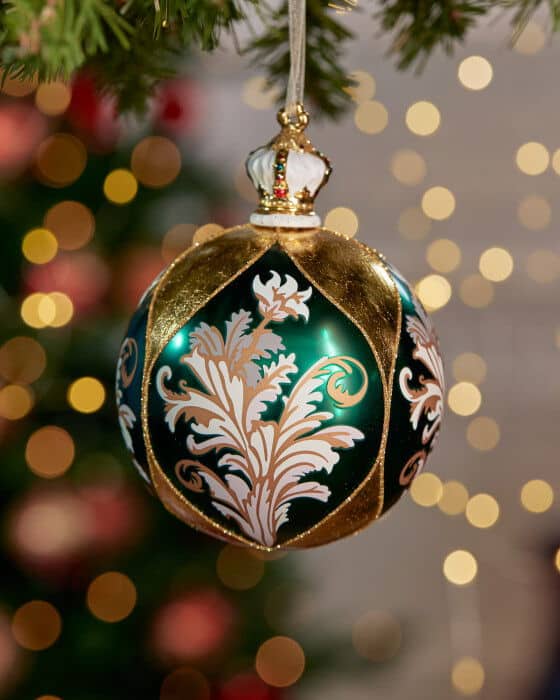 Forstærk julens dekorationer med Lorena julekugle i dybgrønt glas, smukt dekoreret med gyldne barokinspirerede mønstre og en elegant krone på toppen. De kunstneriske detaljer i guld og hvid giver et udtryk af klassisk, kongelig pragt og tidløs elegance. En eksklusiv dekoration, der fanger lyset og bliver et naturligt midtpunkt på juletræet.Noble Collection samler julekugler, der kombinerer tidløs elegance med en følelse af højtidelig pragt. Med unikke mønstre, luksuriøse detaljer og klassisk håndværk bliver hver kugle en dekoration, der løfter juletræet til noget helt særligt. En kollektion skabt til at sprede julestemning og blive en naturlig del af traditionen år efter år.