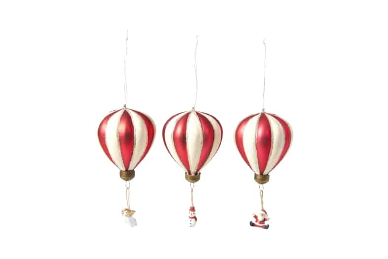 Luftballon med røde og hvide striber og lille figur forneden. Luftballoner er smukke blikfang på grene, juletræer, i vinduet mv. Fås med enten engel, julemand eller snemand. Luftballonerne er fra Speedtsberg. Mål:Højde: 8 cmFremstillet af glas.Pakket med