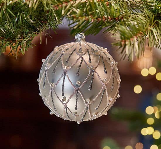 Elegant sølvfarvet julekugle med et flot flæsemønster med små perler, der pynter smukt på juletræet. Skab en fortryllende stemning i dit hjem og pynt dit juletræ med eksklusive julekugler fra Lux. Kollektionen Lux er en unik serie af håndlavede glaskugler i forskellige farver og former med smukke, detaljerede mønstre. En klassisk dekoration til dit hjem, der skaber en ægte julestemning.