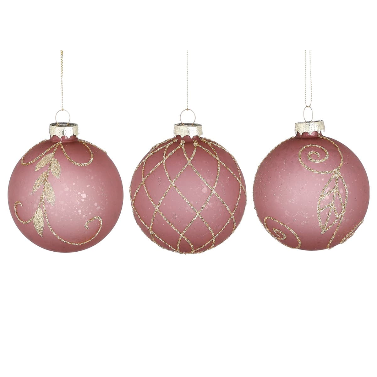 Smukke julekugler i lilla farve med guldfarvet mønster. Julekuglerne findes i tre varianter med enten små blade på, med ternet mønster på eller med store blade på. Mål:Diameter: 8 cmFremstillet i glas.Pakket med 1 stk.
