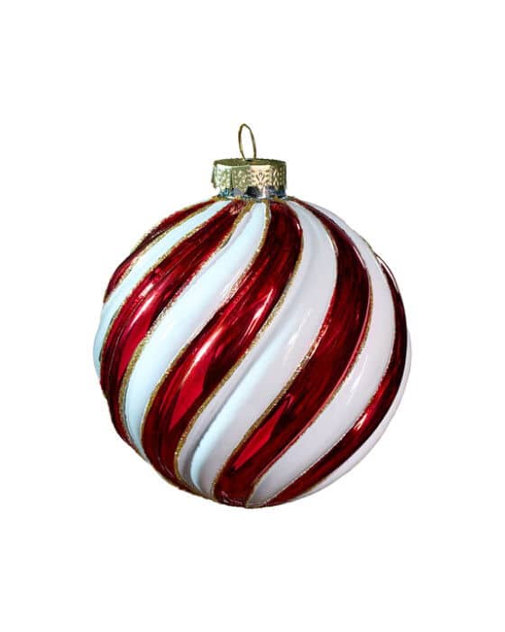 Tidløs og klassisk julekugle af glas. De røde og hvide striber afspejler julens mest ikoniske farver, og de guldglitrende detaljer giver julekuglen en magisk finish. Udvid din samling af juletræspynt med denne smukke, traditionelle julekugle.