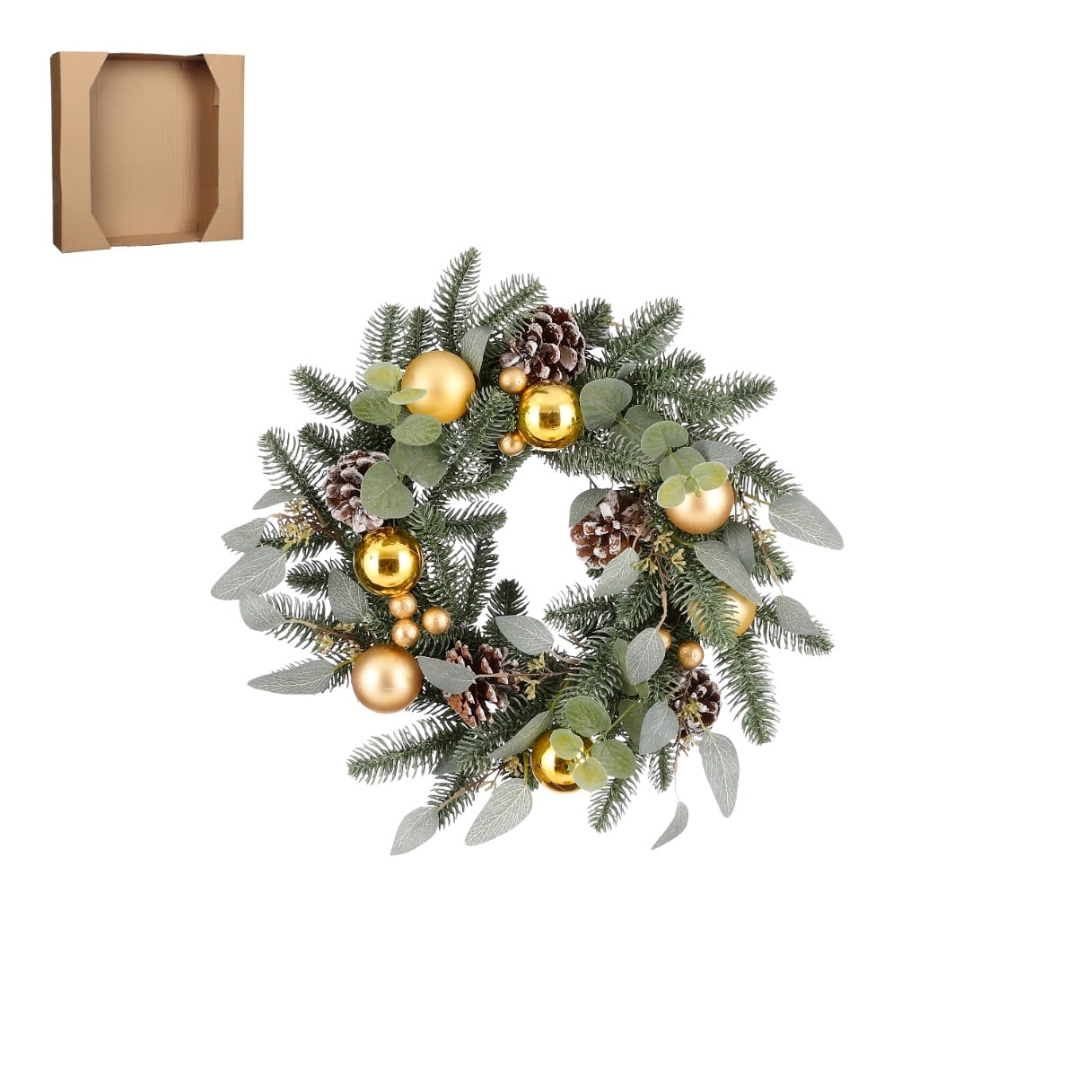 Smuk krans i støvet grøn farve med kunstige grangrene og blade pyntet med klare og matte guldfarvede julekugler samt snedryssende grankogler. Pynter flot hængende på hoveddøren, men kan også lægges på fx et bord. Mål: Diameter: 40 cmHøjde: 10 cmFremstille