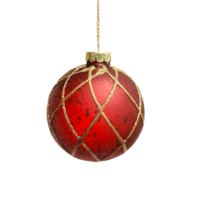 Smukke julekugler i mørkerød farve med guldfarvet mønster. Julekuglerne findes i tre varianter med enten små blade på, med ternet mønster på eller med store blade på. Mål:Diameter: 8 cmFremstillet i glas.Pakket med 1 stk.