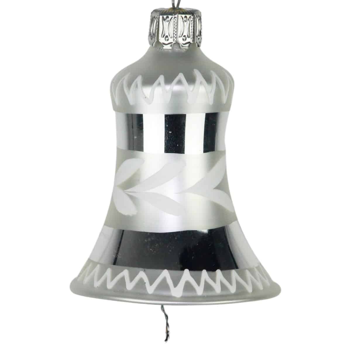 Mundblæst og håndmalet juleklokke i sølvfarvet og mat hvid med grenmønster fra Glasbläserei Thüringer Weihnachten. Meget smukke hængende på juletræet.Mål:Højde: 5 cmFremstillet i glas.Pakket med 1 stk.