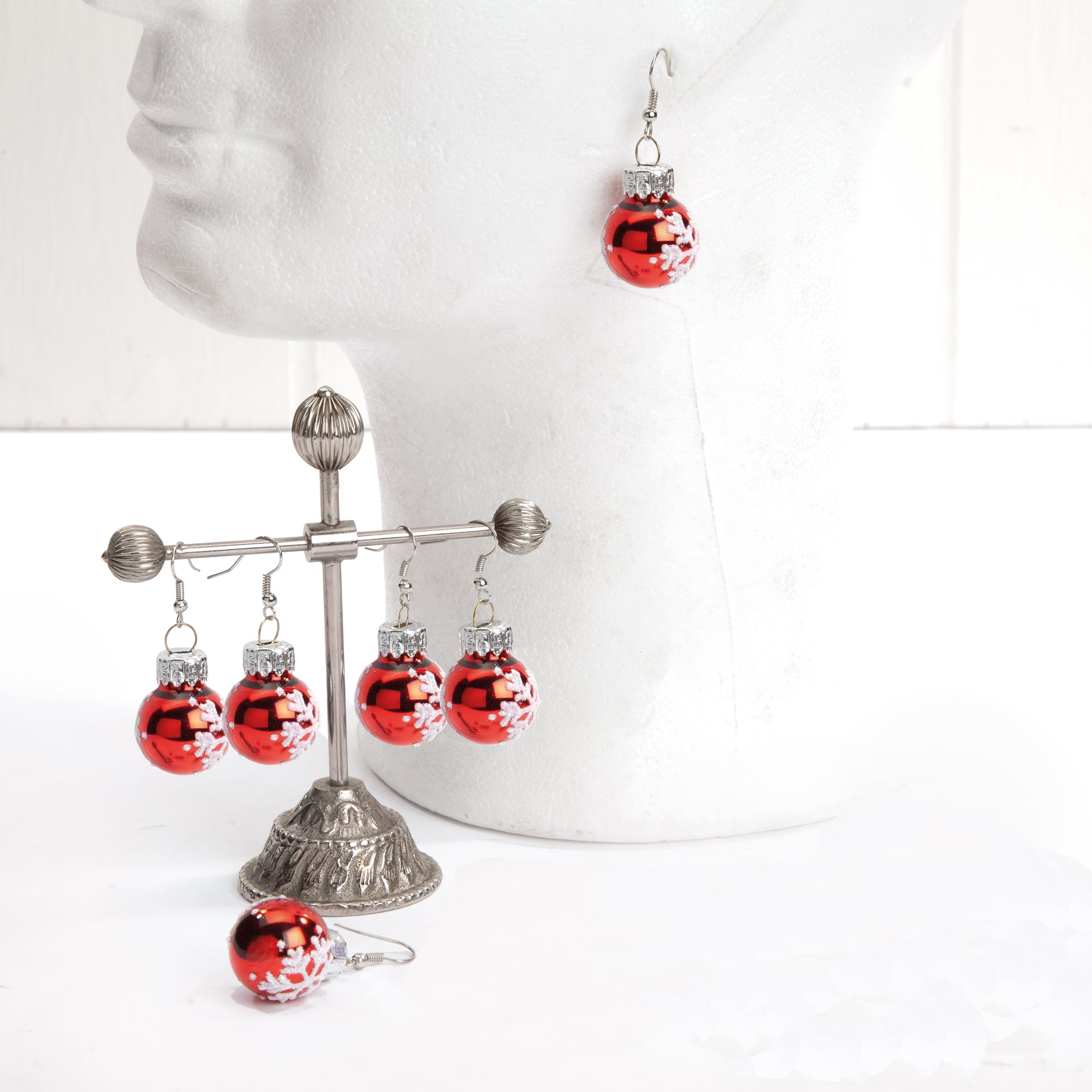 Øreringe med røde julekugler med hvide snefnug på. Måler 2 cm i højden. De indeholder under den tilladte grænse af nikkel som er 0,2mg nikkel/cm2/ugen.