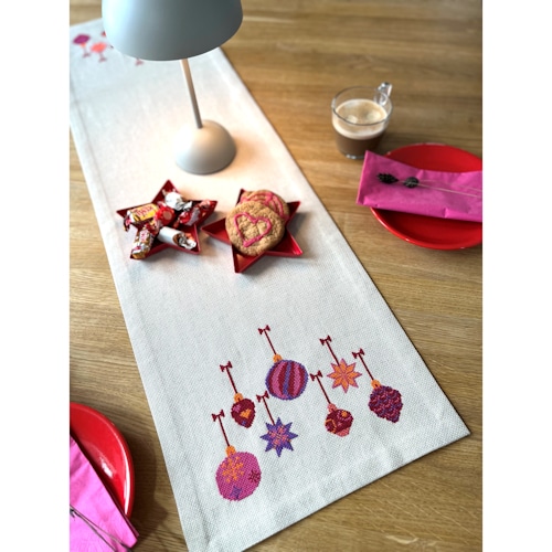 Det perfekte broderikit, til dig elsker at broderer til julen. Denne stilrene og smukke juleløber, broderes med pink, orange, rød og lilla DMC mouline garn, på rustik Aida, med 5,4 sting pr