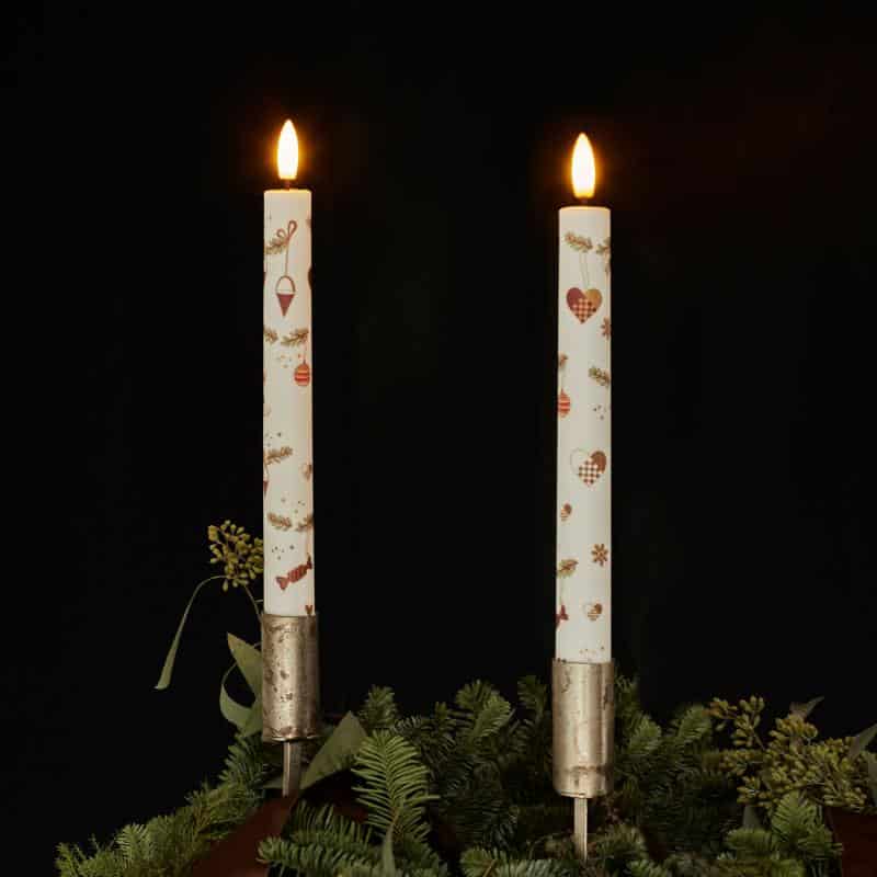Mie kronelyset er smukt dekoreret med julemotiver som hjerter, snefnug og julekugler, der skaber en hyggelig og festlig stemning. Lyset er fremstillet af ægte stearin og har en pulserende, naturtro 3D LED-flamme, der afgiver et blødt, varmt hvidt lys. Mot