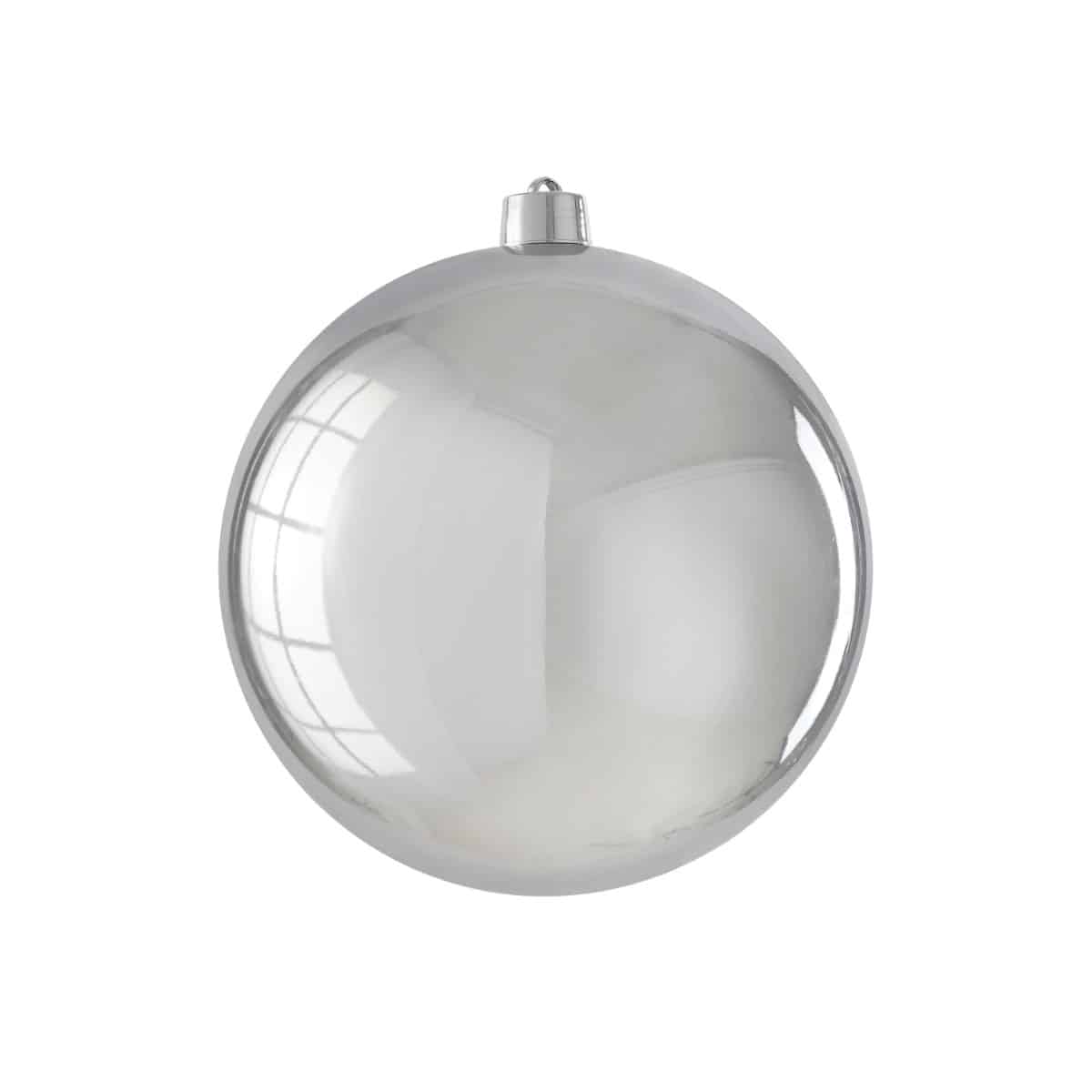 Stor julekugle i skinnende sølvfarvet plast, Ø 25 cm. En dekorativ julekugle, der giver et flot blikfang både indendørs og udendørs. Brug den som pynt i vinduer, ophængt fra loftet eller sammen med gran. Julekuglen er fremstillet i robust, genanvendt plas
