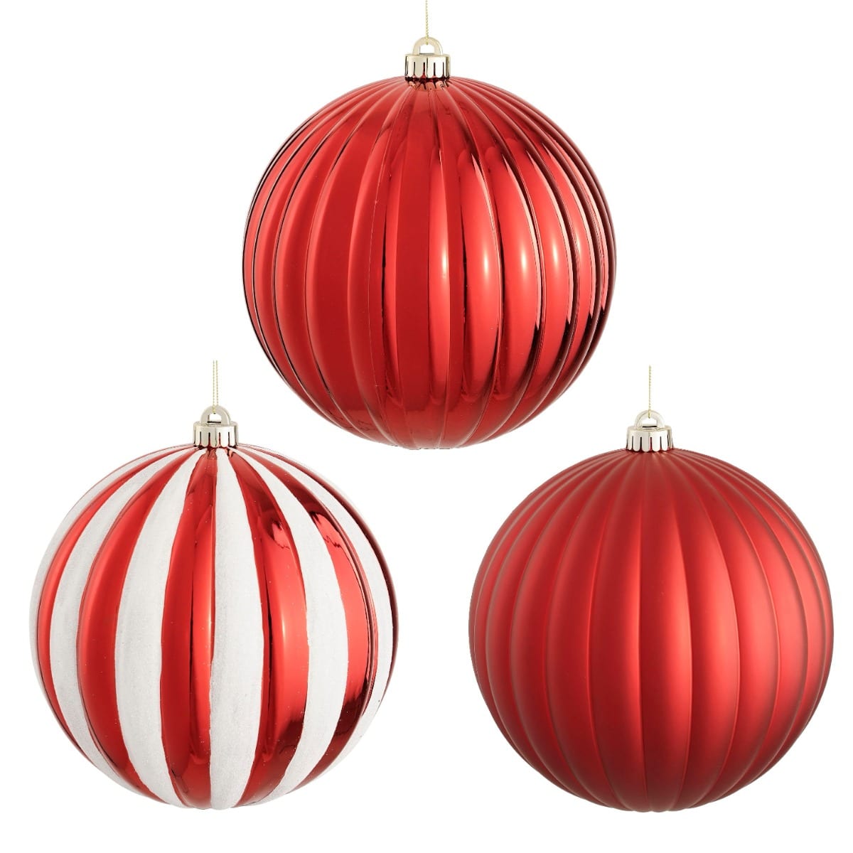 Store julekugler i plast med rillet mønster i enten blank rød, mat rød eller med røde og hvide striber. Julekuglerne kan fx hænges ned fra loftet, i større vinduer eller bruges som udendørs pynt i haven. De store julekugler sørger for klassisk julestemnin