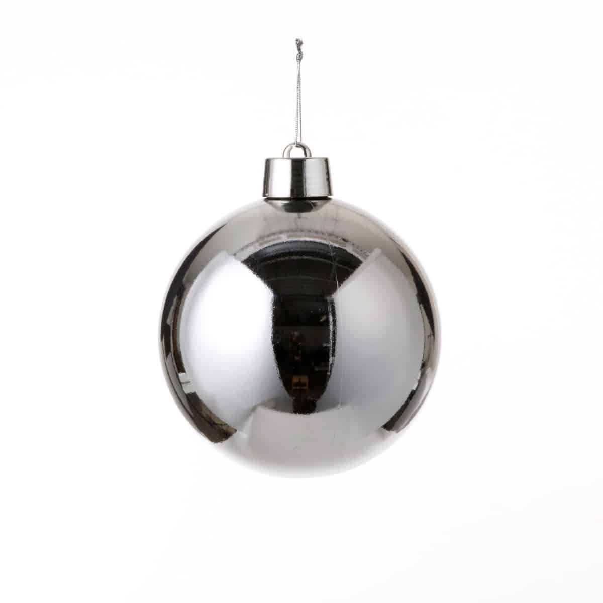 Stor julekugle sølvfarvet diameter 20 cm. Flot julekugle i sølvfarvet med glans. Fremstillet i plast.Pakket med 1 stk.