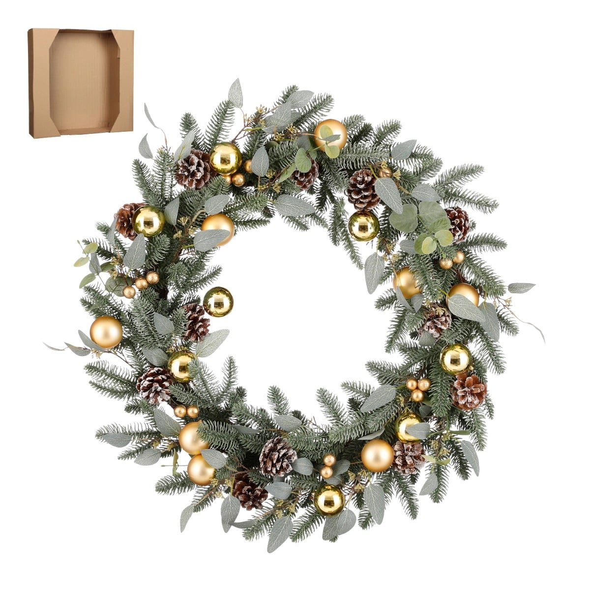 Stor, smuk krans i støvet grøn farve med kunstige grangrene, blade og pyntet med klare og matte guldfarvede julekugler samt snedryssende grankogler. Pynter flot hængende på døren, men kan også lægges på fx et bord eller hænges op i store vinduer. Mål: Dia
