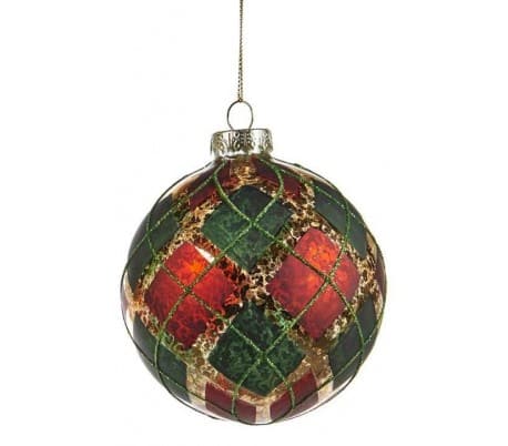 Julekugle udført i sand amerikansk stil, med et design af tartan mønster i rød, grøn og guld. Glaskuglen måler 10 cm i diameter.