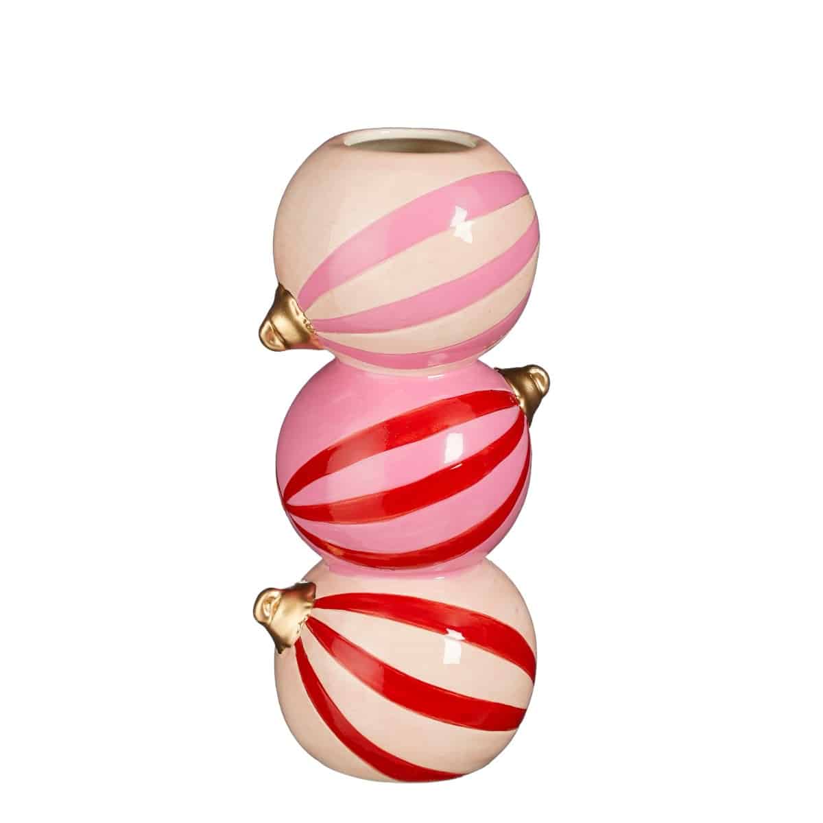 Tre julekugler er her stablet ovenpå hinanden til en finurlig vase. Vasen er i lyserøde og røde nuancer. I samme serie fås også lysestager.Mål:Længde: 10,5 cmBredde: 9 cmHøjde: 21 cmFremstillet af dolomit.Pakket med 1 stk.
